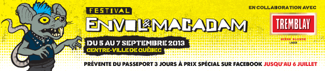 Québec, le 11 juin 2013. La 18e édition du festival Envol et Macadam aura lieu du 5 au 7 septembre prochain. Présenté en collaboration avec la bière Tremblay, l’événement se tiendra à l’Îlot Fleurie située sous l’autoroute Dufferin-Montmorency et dans différentes salles de spectacles du Nouvo St-Roch. Le public pourra se réjouir d’une programmation des plus éclatées et de nombreux spectacles présentés dans un décor urbain unique, alors que le cœur du centre-ville de Québec vibrera au son de la musique alternative pendant les trois jours de l’événement.
