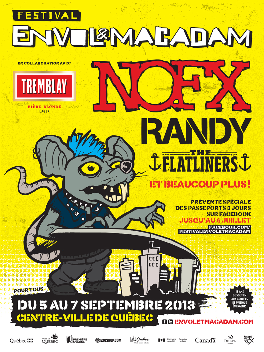 Les organisateurs d’Envol et Macadam sont fiers d’annoncer la venue des formations punk NOFX, Randy et The Flatliners. Ces trois groupes se produiront sur le site principal du festival, à l’Îlot Fleurie, une place de choix où les festivaliers peuvent être à l’abri des intempéries tout en profitant du spectacle.
